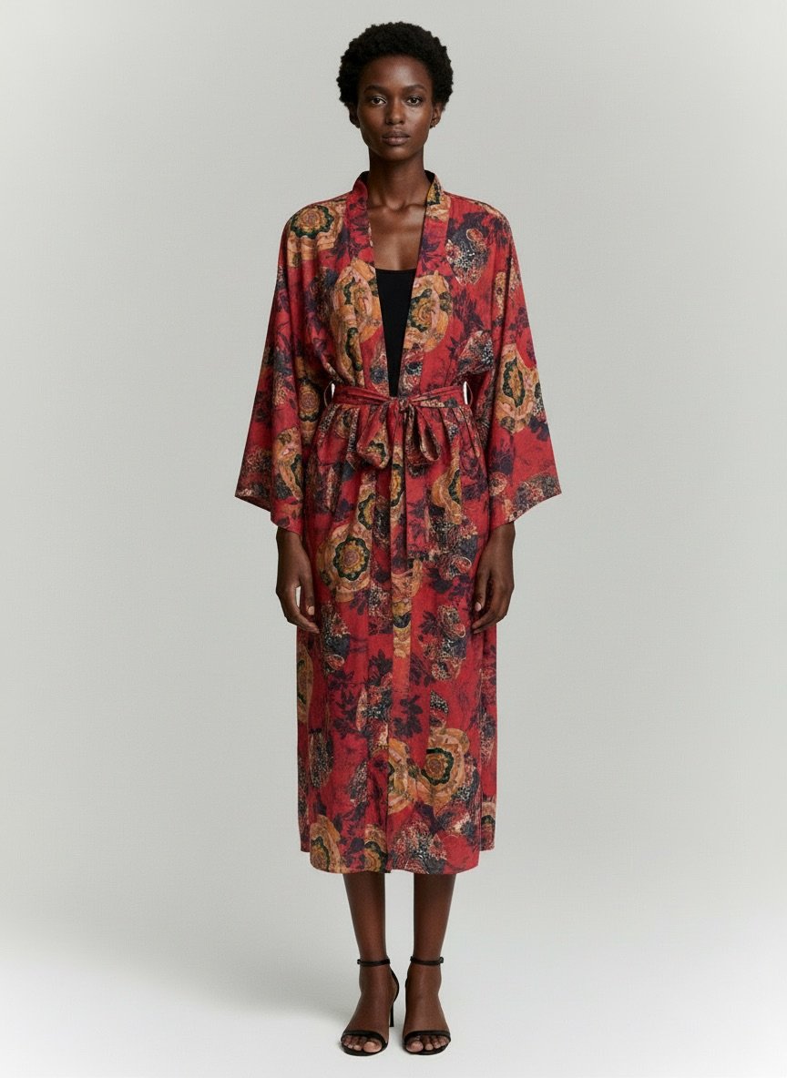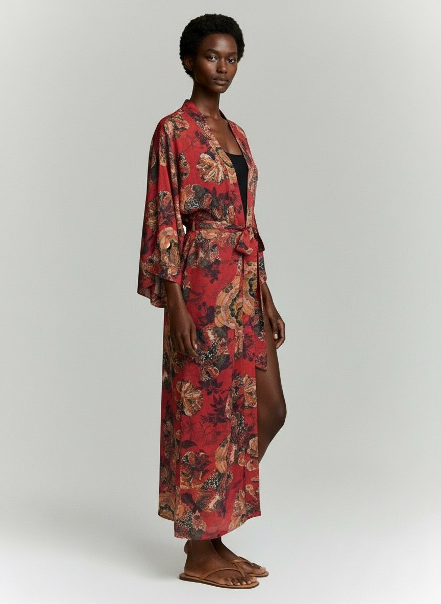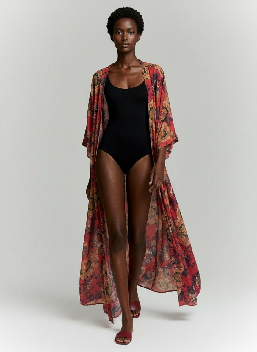 გრძელი და მსუბუქი კიმონო ალისფერი და მიწისფერი ტონებით, დეკორატიული არტისტული პრინტებით. თავისუფალი სილუეტი და ჰაეროვანი ქსოვილი ქმნის ელეგანტურ მოძრაობას. იდეალურია რეზორტის სტილისთვის, პლაჟის ლუქისთვის ან მინიმალისტურ სამოსზე დასამატებლად.