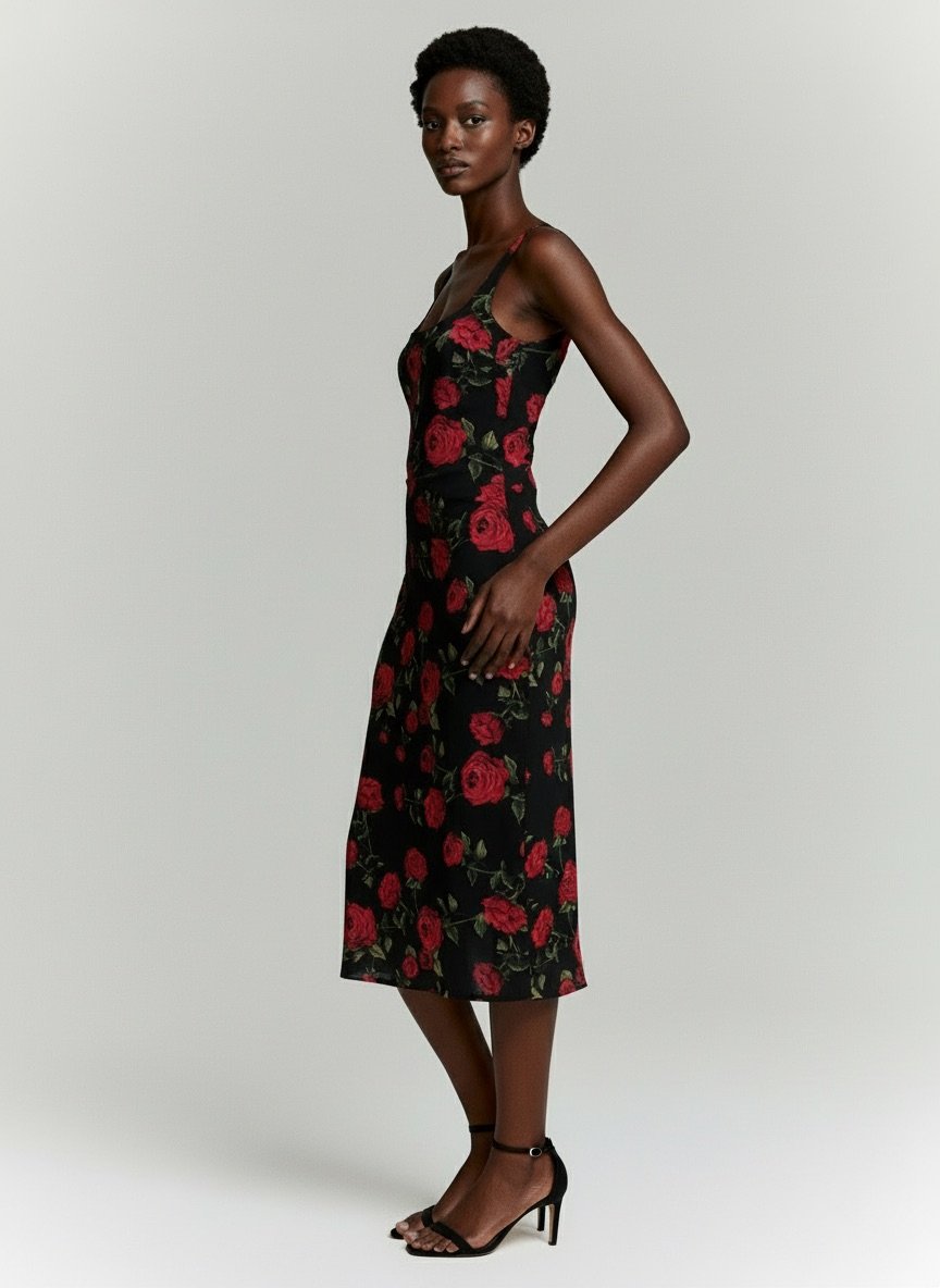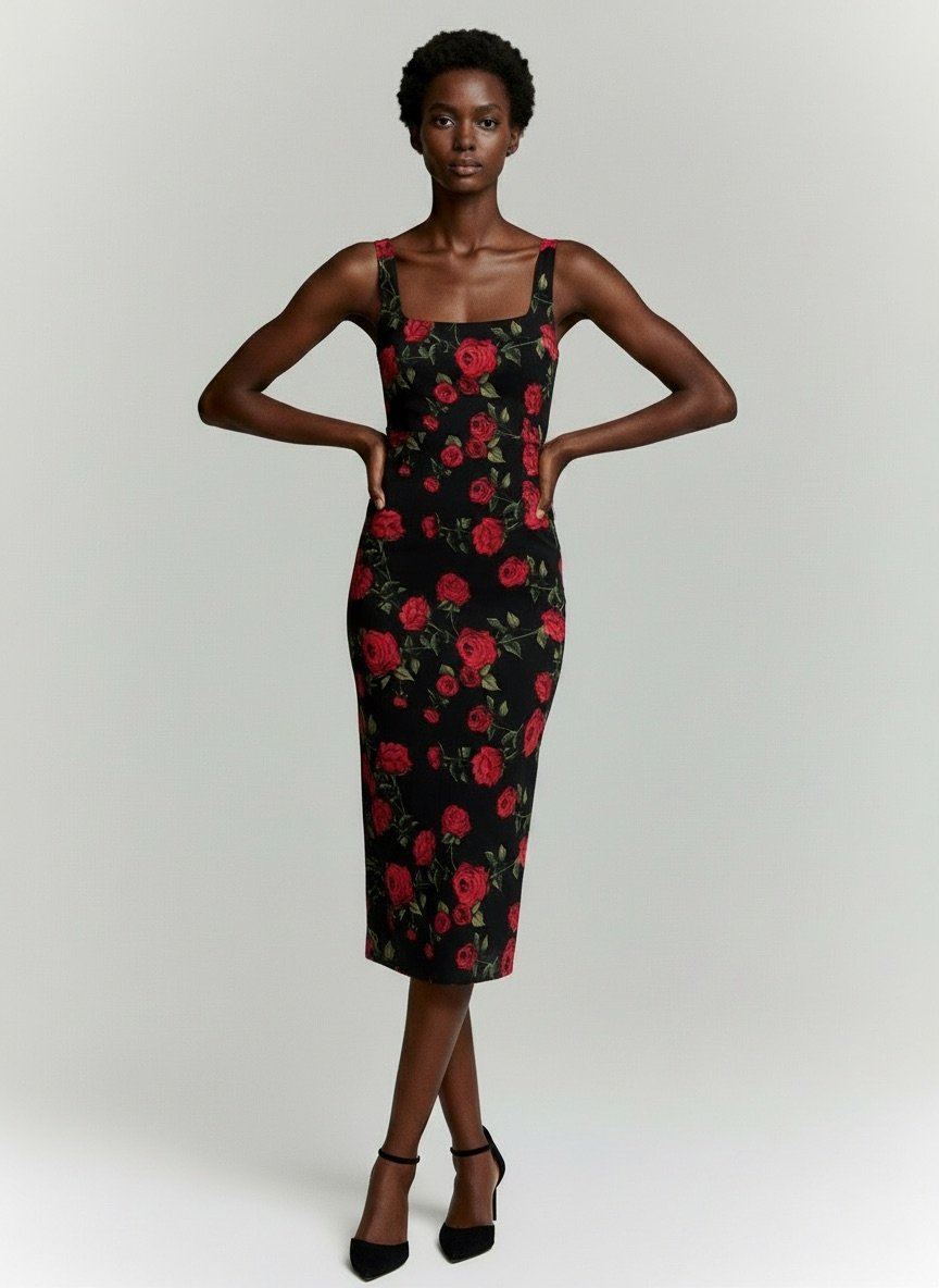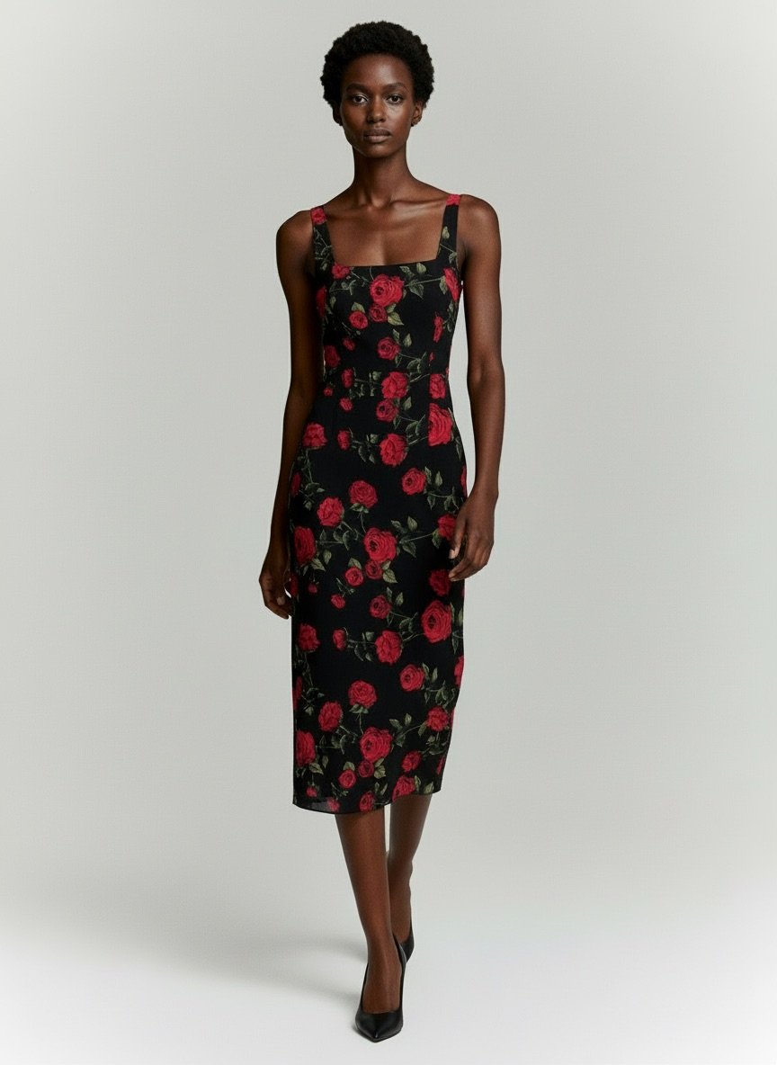 შავი ფონზე წითელი ვარდების პრინტით ეს მიდი კაბა ქმნის რომანტიკულ და შთამბეჭდავ იერს. სხეულზე მომდგარი სილუეტი და ელეგანტური ბრეტელები ხაზს უსვამს ქალურობას — იდეალურია როგორც დღის, ასევე საღამოს სტილისთვის.